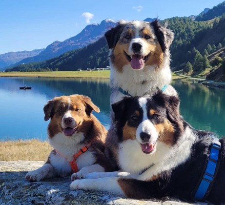 Bowtruckels Honigtau "Fleur" Ausstellungsergebnisse Fleur Hündin, blue merle c/w, HD: A/A; ED: 0/0; LÜW:1, MDR (+/+), HSF4 (N/N), PRA (N/N), CEA (N/N), DM (N/N), NCL6 (N/N), NCL8 (N/N), red factored, Welpen AU frei Fleur wohnt nun zusammen mit einer älteren Aussiehündin names Yuki bei Esther in der Schweiz. Inzwischen hat sich auch noch mit Bowtruckels Insider eine weitere Hündin dem Rudel angeschlossen. In ihrem neuen Zuhause wird sie in Zukunft Hundesport betreiben sowie lange Wanderungen in den Bergen unternehmen und außerdem hoffen wir sie auch auf der einen oder anderen Hundeausstellung wieder zu treffen.